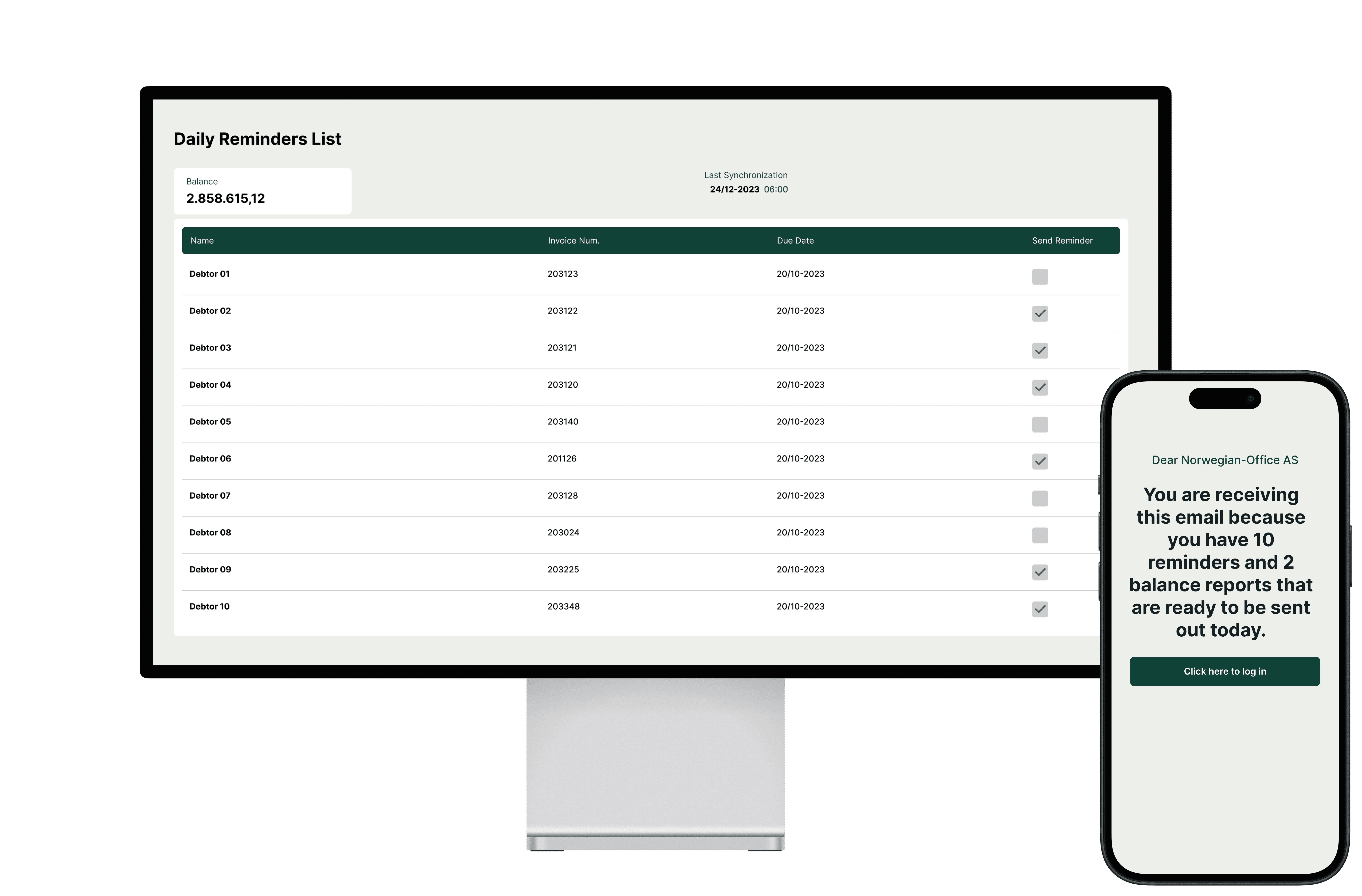 With invoice follow-up to your account and debt collection to client account in the same software, you get full overview and control over the entire recovery process.