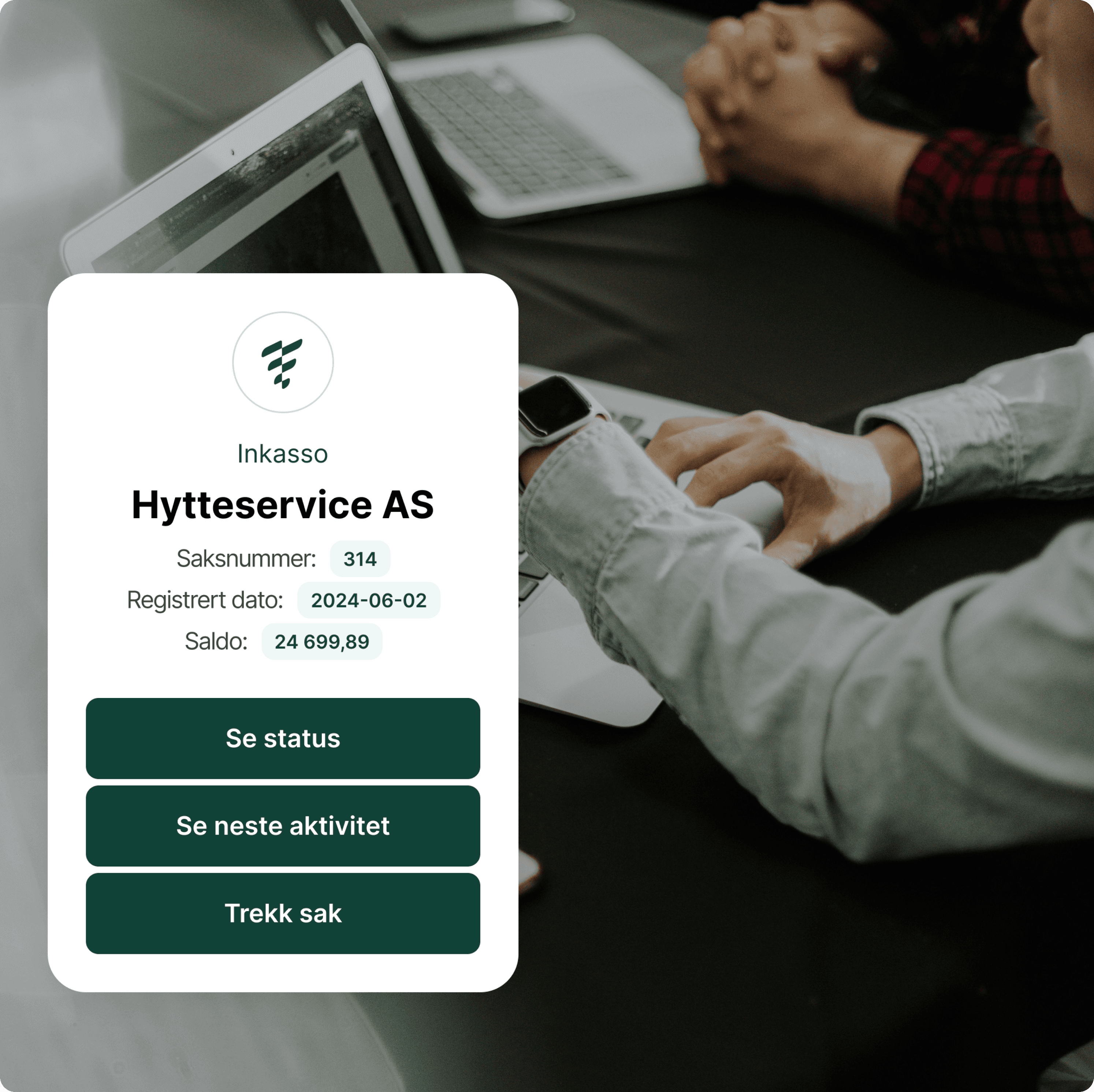 Med fakturaoppfølging til din konto og inkasso til klientkonto i samme programvare, får du full oversikt og kontroll over hele inndrivelsesprosessen.